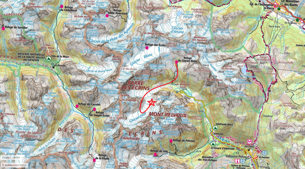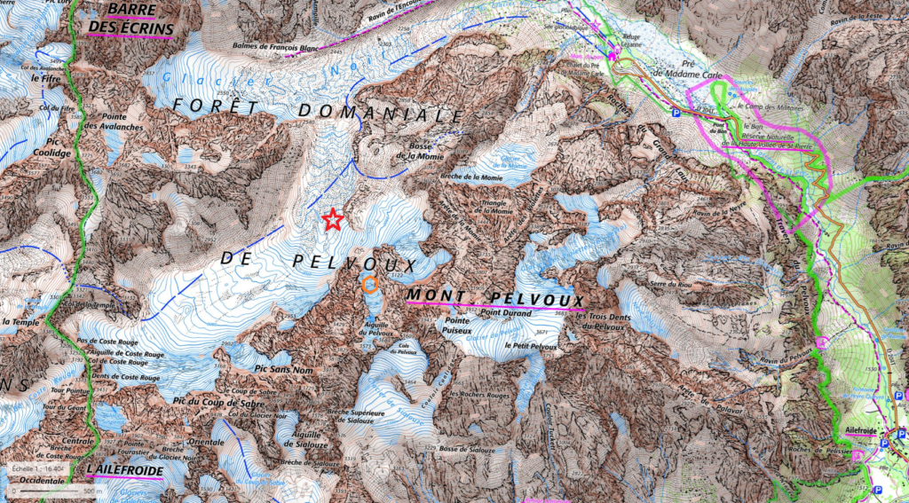 A la faveur d’une éclaircie, malgré les nuages bas environnants, ils remettent en route et remontent le Glacier Noir, par le ravin de l’Encoula, en direction de la face nord du Pelvoux. Ils rasent les flancs du versant sud du pic Coolidge et effectuent un virage pour rejoindre les flancs nord-ouest du Pelvoux. Sur place la situation n’est pas très bonne, ils sont séparés du CRS et de la dernière victime par une couche de stratus. Au-dessus le soleil brille, à leur niveau c’est la purée de pois… Peut-être espéraient-ils remonter le couloir nord en prenant l’arête rocheuse comme repère, c’est une manœuvre qu’ils ont due, moultes fois réaliser dans d’autres secours, mais à cet instant les conditions se dégradant plus que de mesure, ils sont obligés de renoncer pour revenir au refuge.