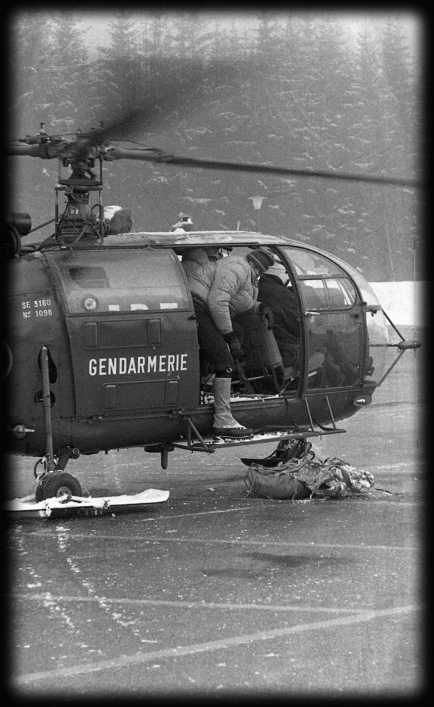 Mais le mercredi matin, il est à peine 6 h que déjà les pales de l’Alouette 3* tournent. Une éclaircie, pas question d’attendre. Aux commandes, l’adjudant Cuenot embarque avec son mécanicien, le lieutenant Mollaret et le guide Yvon Masino. Et il lui en faut de l’adresse ! « Le vent soufflait avec une telle force que je n’imaginais pas qu’il pourrait poser l’Alouette au sommet du Tacul ››, se souviendra Mollaret. « Nous recevions de terribles coups de boutoir qui, frappant l’hélicoptère sous le flanc, le soulevaient de 10 a 20 mètres, menaçant chaque fois de le faire basculer ».* [Aerogend.com] : Il s’agit de l’Alouette III N° 1098 FM-JBF