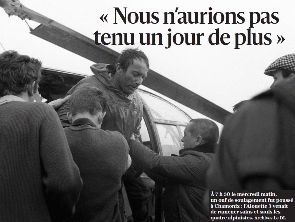 Mais Cuenot réussit. Et, seconde bonne nouvelle, quand l’Alouette se pose, deux hommes sont aperçus ! Jean Fanton se rapproche en soutenant Alain Badel. Aussitôt à bord, direction Chamonix. Quelques minutes plus tard Claude Jäger et Roberto Sorgato, plus affaiblis, sont aussi récupérés par le lieutenant Mollaret et le guide Yvon Masino. Et voilà l’Alouette qui revient. L’équipage, les secouristes, deux rescapés : c’est trop. Sauf que la météo se gâte franchement… « Je ne suis pas sûr de pouvoir revenir vous chercher », annonce Cuenot à Mollaret. « Je vous embarque. Ce sera tangent, mais j’aime mieux ça que de vous laisser ici. »